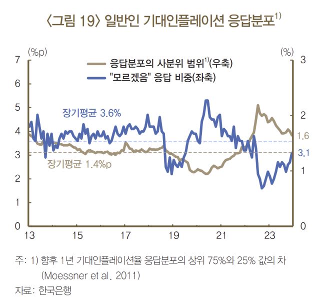 한은은 “인플레이션 기대 및 품목별 분포를 보면 아직 가격조정 모멘텀이 남아있는 데다 비용충격이 추가로 발생할 여지도 여전히 존재하는 것으로 보인다”며 “부문간 인플레이션의 파급은 아직 충분히 진정되지 않은 것으로 보인다”고 진단했다.