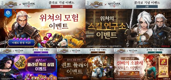 ▲태생 5성 물 속성 게롤트를 획득할 수 있는 ‘위쳐의 모험’ ▲위쳐의 증표를 사용해 컬래버 캐릭터의 스킬 레벨을 상승시킬 수 있는 ‘위쳐의 스킬 연구소’ ▲누적 증표 획득 수에 따라 열리는 ‘컬래버 특별 상점 오픈’ ▲신비의 소환서 최대 10장을 획득할 수 있는 ‘궨트 플레이’ 이벤트 등이 오는 3월 31일까지 전개된다.