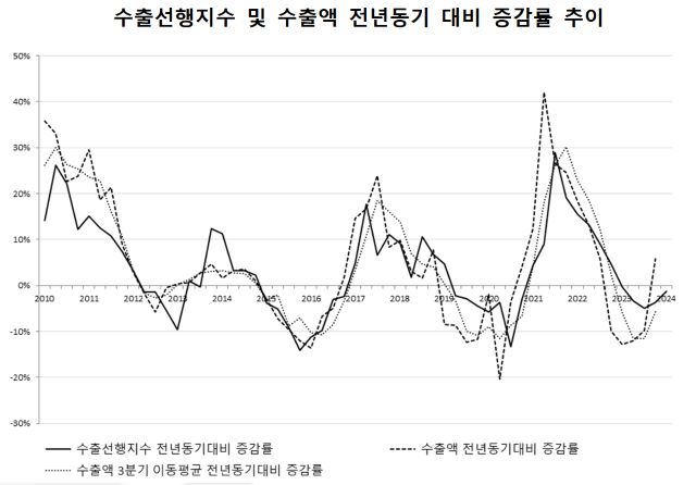 수출선행지수는 주요 수출국의 경기, 수출용 수입액, 산업별 수주 현황, 환율 등 수출에 영향을 미치는 변수들을 종합해 수출증감 정도를 예측할 수 있도록 만든 지수다. 수출선행지수는 전년 동기 대비 기준 지난해 3분기 -6.4p에서 4분기 -4.7p로 줄어들었고 올해 1분기 -1.5p로 전망된다.