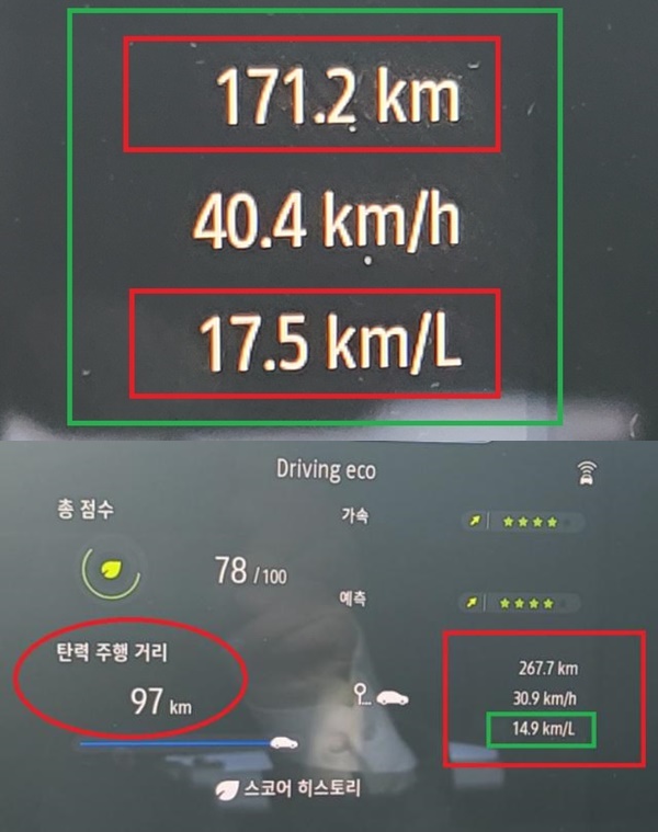 앞서 지난 10월에 시승했을 때는 총 267.7km를 평균속도 30.9km/h로 주행한 후 14.9km/l를 기록했지만 하지만 이번에는 똑같은 차량으로 평균속도 40.4km/h로 주행한 후 체크 한 실제 복합 연비가 17.5km/l 기록해 몹시 놀라울 뿐이었다.