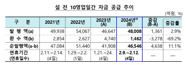 8일 한은이 설 전 10영업일(1월 26일~2월 8일) 금융기관에 공급한 화폐(순발행액=발행액-환수액)는 4조 7000억원으로 집계됐다. 전년 동기 대비 약 5000억원(11.1%) 증가했다.