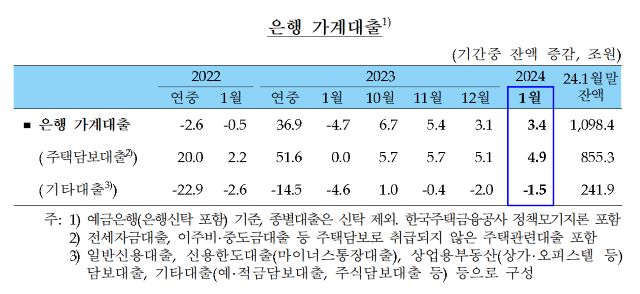 기업대출은 연말 일시항환분 재취급, 부가가치세 납부 수요 등 계절요인의 영향으로 대기업과 중소기업 대출 모두 증가 전환됐다. 지난해 12월 5조 9000억원 감소했지만 지난달 6조 7000억원 증가했다.