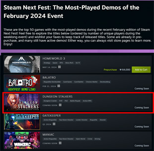 한편 SF(공상과학) RTS(실시간 전략게임) 홈월드3(Homeworld 3) 등의 쟁쟁한 개발사에서 낸 신작 게임들과 함께 최다 플레이 데모게임 중 하나에 선정된 던전스토커즈는 테스트 기간 중 글로벌 유저들의 피드백을 받아 게임의 완성도를 높혀 나간다는 계획이다.