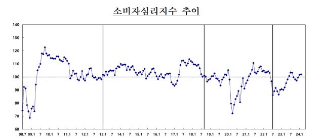 20일 한국은행이 발표한 ‘2024년 2월 소비자동향조사 결과’에 따르면 2월중 소비자심리지수는 101.9로 2개월 연속 100을 상회했다. CCSI는 6개 주요지수를 이용해 산출한 심리지표로서 100보다 크면 낙관적, 100보다 작으면 비관적임을 의미한다.