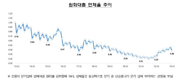 22일 금융감독원이 발표한 ‘2023년 12월말 국내은행의 원화대출 연체율 현황(잠정)’에 따르면 지난해 12월말 국내은행의 원화대출 연체율(1개월 이상 원리금 연체기준)은 0.38%로 전월말(0.46%) 대비 0.08% 하락했다. 전년 동월말(0.25%) 대비로는 0.13%p 상승했다.