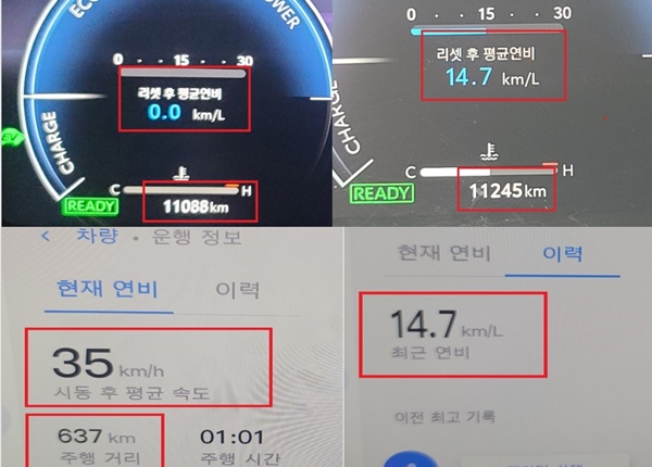 총 157km를 시속 35km/h의 평균 속도로 1박 2일 시승한 후 체크 한 토요타 7인승 하이랜더 2.5L HEV 플래티넘 모델의 실제 주행 연비는 놀랍게도 14.7km/ℓ를 기록했다.