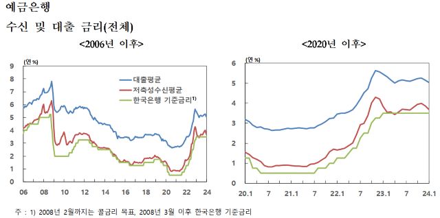 29일 한국은행이 발표한 ‘2024년 1월 금융기관 가중평균금리’에 따르면 지난달 예금은행의 신규취급액 기준 저축성수신금리는 연 3.67%로 전월 대비 0.18%p 하락했다. 대출금리는 연 5.04%로 전월 대비 0.10%P 하락했다.