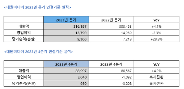 대원미디어, 23년 온기 연결 매출 3161억원 기록…역대 최대