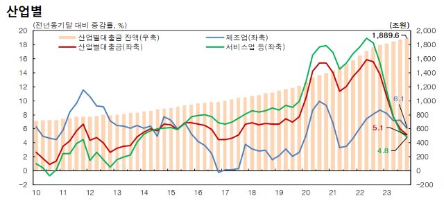 7일 한국은행이 발표한 ‘2023년 4분기 예금취급비관 산업별대출금’ 자료에 따르면 지난해 4분기말 예금취급기관의 산업별대출금 잔액은 1889조 6000억원으로 전분기말 대비 13조 9000억원 증가했다. 전분기 대비(+32조 2000억원)에 비해 증가폭은 축소됐다.