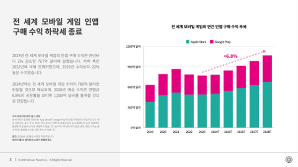 2024년에는 전 세계 모바일 게임 수익이 780억달러로 반등할 것으로 예상되며, 2028년 예상 수익은 연평균 6.8%의 성장률을 구가해 1000억달러를 돌파할 것으로 전망된다.