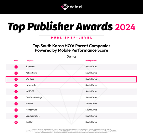 (서울=NSP통신) 이복현 기자 = 위메이드(대표 장현국)가 글로벌 모바일 앱 마켓 분석 사이트 데이터에이아이(data.ai)가 선정한 ‘2024년 상위 퍼블리셔 어워드’에서 국내 퍼블리셔 부문 3위에 올랐다.