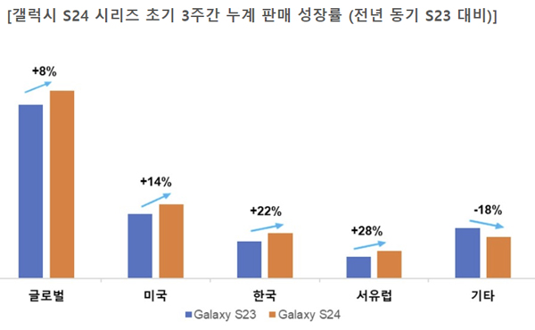 3주간의 누적 실적에서 갤럭시 S24 플러스의 비중이 21%를 차지했다. 전작대비로는 53% 증가하여 큰 폭의 성장세를 보여줬다.