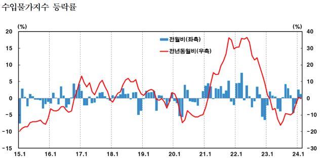 15일 한국은행이 발표한 ‘2024년 2월 수출입물가지수(잠정)’에 따르면 지난달 수입물가(원화기준)는 국제유가 및 원·달러 환율 상승의 영향으로 광산품, 화학제품 등이 오르며 전월 대비 1.2% 상승했다. 전년 동월 대비로는 0.2% 하락이다.