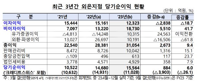 지난해 본점 부실화로 영업을 축소하며 거액 손실(-4536억원)이 발생한 크레디트스위스는 집계에서 제외됐다. 크레디트스위스를 포함하면 전체 외은지점 순이익은 1조 1028억원으로 전년 대비 3903억원 감소했다.