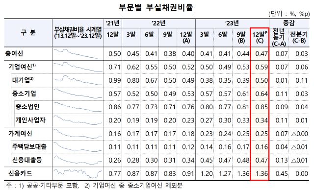 21일 금융감독원이 발표한 ‘2023년 12월말 국내은행의 부실채권 현황(잠정)’에 따르면 지난해말 국내은행의 부실채권비율은 0.47%로 전분기말(0.44%) 대비 0.03%p 상승했다. 전년 동기 대비로는 0.07%p 상승이다.