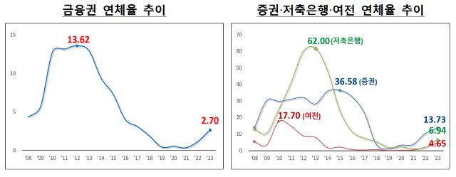 지난해말 전금융권 부동산PF대출 연체율은 2.70%로 전분기말 대비 0.28%p 상승했다. 저축은행은 1.38%p, 은행은 0.35%p, 여전사는 0.21%p 상승했으나 상호금융은 1.06%p, 증권은 0.11%p, 보험은 0.09%p 하락했다.