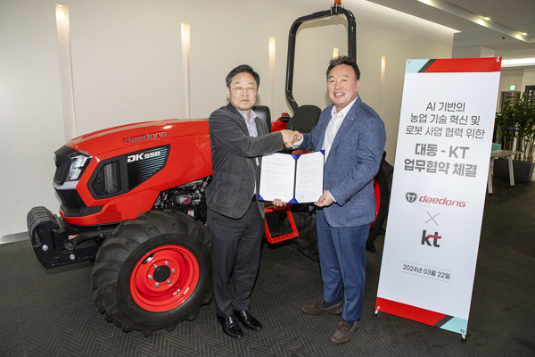 (서울=NSP통신) 이복현 기자 = KT가 대동과 손잡고 인공지능(AI) 기반 정밀 농업 서비스 개발과 로봇 사업을 통한 농업 AI 시장 개척에 나선다. KT(대표 김영섭)와 대동(공동대표 김준식, 원유현)은 지난 22일 서울특별시 서초구에 위치한 대동 서울사무소 사옥에서 업무협약(MOU)을 체결했다.