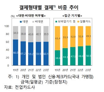 한편 모바일기기 등을 이용한 결제규모는 10.8% 증가해 실물카드를 이용한 결제규모(+1.9%)보다 큰 폭으로 증가했다. 이에 따라 전체 결제 중 모바일기기 등을 이용한 결제비중은 2019년 38.6%에서 2021년 47.1%, 2023년 50.5%로 지속적으로 확대되고 있다.