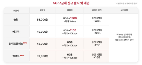 베이직(월 4만9000원) 요금제의 데이터 제공량을 8GB에서 11GB로, 슬림(월 5만5000원) 요금제의 제공량을 11GB에서 15GB로 늘린다.