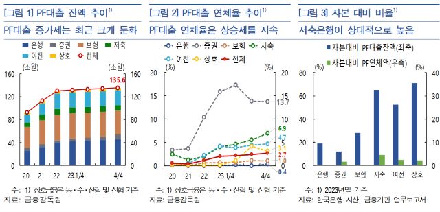 감독당국은 증권사, 여전사 및 전축은행에 대해 PF대출 및 채무보증 규모를 ▲증권사의 경우 PF대출이 자기자본의 30%, 채무보증은 자기자본의 100% ▲여전사의 경우 PF대출 및 채무보증의 합계액이 여신성자산의 30% ▲저축은행은 PF대출이 신용공여 총액의 20% 이내로 제한하고 있다. 상호금융은 올해, 새마을금고는 내년부터 부동산·건설업에 대한 대출취급 한도를 총 대출의 각각 30%, 합계는 50%로 제한할 예정이다.