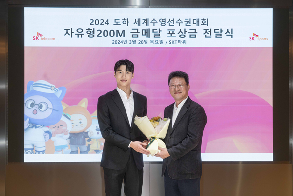 (서울=NSP통신) 이복현 기자 = SK텔레콤(대표 유영상)이 지난 2월 카타르 도하 세계수영선수권대회에서 뛰어난 성적을 거둔 황선우 선수를 위한 포상식을 열고, 특별 포상금을 지급했다.