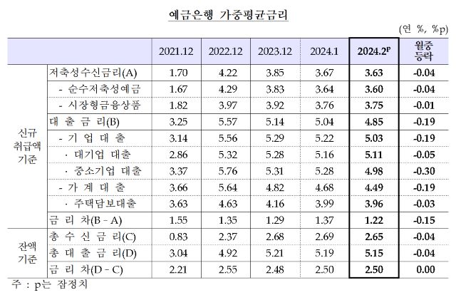 29일 한국은행이 발표한 ‘2024년 2월 금융기관 가중평균금리’에 따르면 지난 2월중 예금은행의 신규취급액 기준 저축성수신금리는 연 3.63%로 전월 대비 0.04%p 하락했다. 대출금리는 연 4.85%로 전월 대비 0.19%p 하락했다.