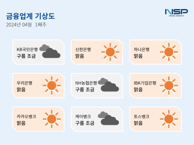 (서울=NSP통신) 강수인 기자 = 2024년 4월 1주차 금융업계기상도는 신한은행·하나은행·우리은행·IBK기업은행·카카오뱅크·토스뱅크의 ‘맑음’, KB국민은행·NH농협은행·케이뱅크의 ‘구름조금’으로 기록됐다.