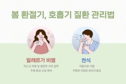 봄철에는 꽃가루, 미세먼지, 집 먼지 등 알레르기를 유발하는 항원 때문에 코 점막에 염증이 생기는 알레르기 비염에 시달리기 쉽다. 코나 눈이 가렵거나 콧물, 재채기, 코 막힘 등의 증상이 반복되고, 눈 충혈, 두통, 후각 감퇴 등의 증상이 동반될 수 있다. 감기와 증상이 비슷해 방치하는 쉬운 알레르기 비염은 천식, 부비동염, 중이염으로 이환될 가능성이 높아 조기 치료가 중요하다. 항원에 노출되지 않도록 하는 것이 가장 좋지만 현실적으로 쉽지 않기에 약물치료를 시행하는 것이 일반적이다. 콧속에 분무하는 스프레이제나 콧물과 가려움증을 덜어주는 경구용 항히스타민제가 주로 쓰인다.