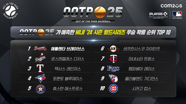 컴투스(대표 남재관)는 자회사 아웃 오브 더 파크 디벨롭먼츠(Out of the Park Developments)의 MLB, KBO 공식 라이선스 야구 게임 ‘아웃 오브 더 파크 베이스볼 25(이하 OOTP 25)’가 진행한 2024 야구 리그 시뮬레이션 결과를 공개했다.