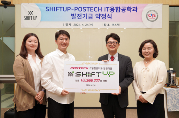 (서울=NSP통신) 이복현 기자 = 시프트업(대표 김형태)이 포스텍(총장 김성근) IT융합공학과와 우수인재 양성을 위한 ‘학과발전기금 약정식’을 진행했다고 밝혔다.