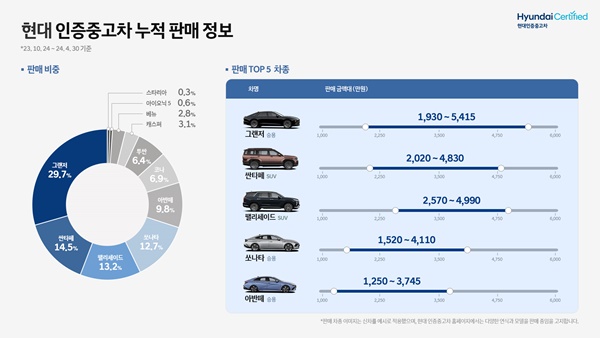 현대차는 지난해 10월 시작한 인증중고차 사업에서 지난 4월 30일 누적 기준 그랜저가 현대 브랜드 전체 판매량의 29.7%를 기록했다고 9일 밝혔다. 이어 싼타페(14.5%), 팰리세이드(13.2%) 순서로 판매 비중이 높았다.