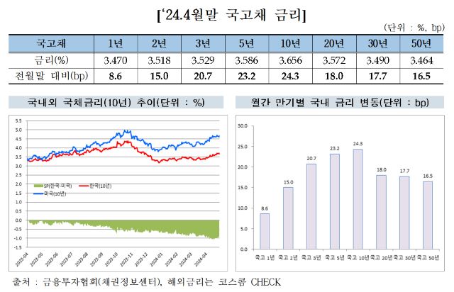 금투협은 “국내 채권금리는 한국은행 금융통화위원회 금리 동결 결정(현 3.50%)이 예상에 부합한 가운데 예상을 상회한 미국 고용·물가지표와 우리나라 1분기 GDP 성장률이 약세 재료로 작용해 상승 마감했다”고 밝혔다.