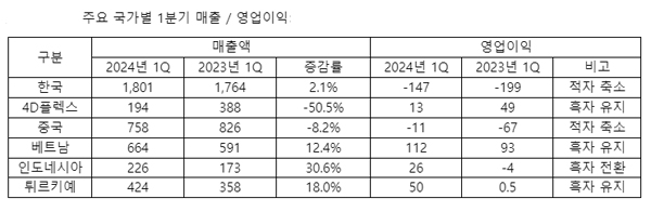 각 국가별로 살펴보면 국내에서는 매출 1801억원, 영업손실은 전년 동기 대비 52억원 개선한 147억원을 기록했다. 지난해 ‘서울의 봄’에 이어 ‘파묘’가 천만 관객을 달성하며 매출 증가에 기여했다. F&B와 다양한 MD 상품 등 컨세션 매출 비중 증가로 수익성이 개선돼 영업 적자도 줄어들었다.