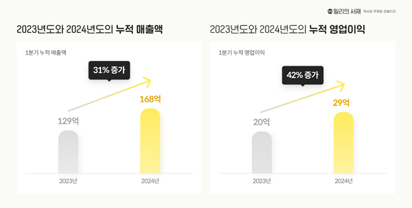 밀리의서재(대표 박현진)는 올해 1분기 매출이 전년 동기 대비 31% 증가한 168억 원을 기록했다고 13일 공시했다. 같은 기간 영업이익은 29억 원으로 전년 동기 대비 42% 증가했다.