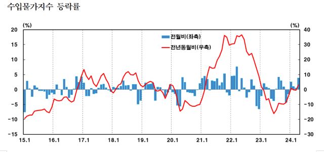 14일 한국은행이 발표한 ‘2024년 4월 수출입물가지수 및 무역지수(잠정)’에 따르면 4월 수입물가(원화기준)는 전월 대비 3.9% 상승했다. 전년 동월 대비로는 2.9% 상승이다.