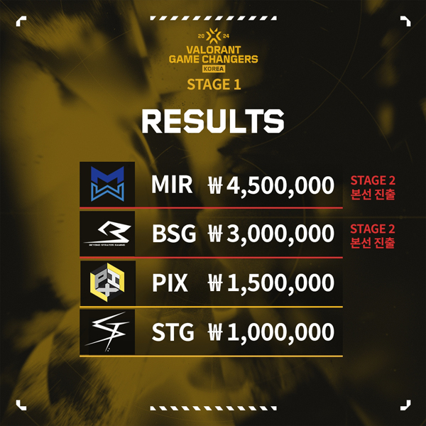 2024 발로란트 게임 체인저스 코리아 스테이지 1에서 우승을 달성한 MIR Gaming에는 상금 450만 원이 수여됐고, 준우승을 한 BSG GC에는 상금 300만 원이 수여됐다. 또 두 팀에는 스테이지 2 본선 진출권이 주어졌다. 다음 2024 발로란트 게임 체인저스 코리아 스테이지 2는 7월에 열릴 예정으로, 자세한 내용은 추후 공개된다.