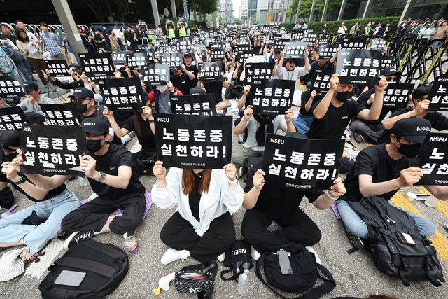 NSP통신-삼성전자 노동조합 조합원들이 24일 서울 강남구 삼성전자 사옥 앞에서 두 번째 단체활동을 벌이고 있다. (사진=연합뉴스)