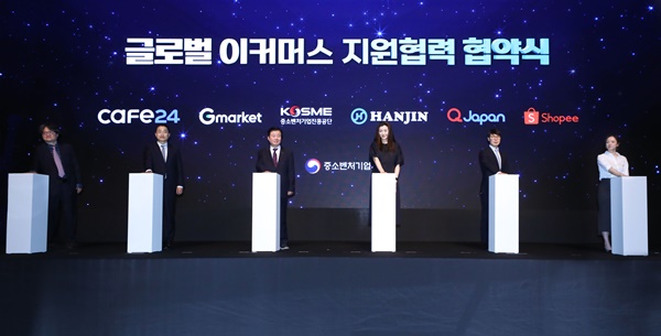한진은 31일 오후 서울 을지로 DDP아트홀에서 중진공을 비롯해 글로벌 플랫폼 및 마케팅 지원, 온라인몰 등 5개 기업이 참석한 가운데 국내 중소벤처기업의 온라인 수출 저변 확대를 위한 글로벌 이커머스 지원협력 협약식 및 공동선언식을 가졌다.