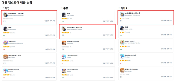 6일 론칭 직후에는 대만과 마카오 애플 앱스토어 최고 매출 1위, 홍콩 애플 앱스토어 최고 매출 2위를 달성하며 현지 유저들의 관심과 함께 라그나로크 IP 게임의 저력을 입증했다.