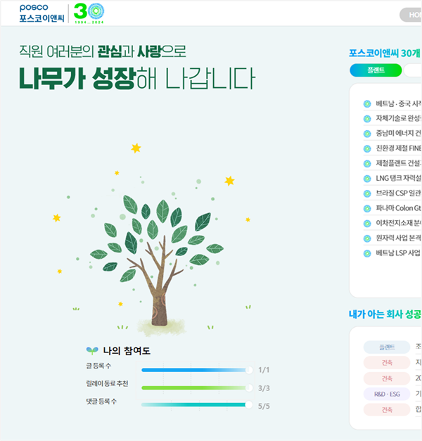 (서울=NSP통신) 강은태 기자 = 올해 12월 1일 창립 30주년을 맞는 포스코이앤씨(대표 사장 전중선)가 지난 30년의 성장과 도전의 역사를 임직원이 함께 공유하는‘창립 30주년 성공스토리 앱’을 사내에 오픈했다.