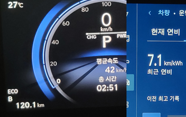이유는 앞서 지난 3월 초 총 161.2km 시승 당시 복합전비는 5.8km/kwh를 기록했으나 이번 시승에선 놀랍게도 7.1km/kwh를 기록했기 때문.