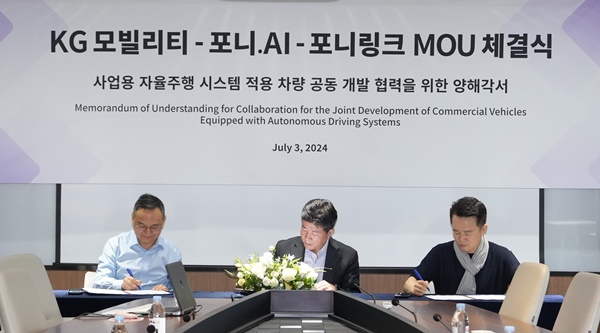 (서울=NSP통신) 강은태 기자 = KG 모빌리티(이하 KGM)가 3일 KG 타워에서 포니 AI(PONY.AI Mobility), 포니링크(PonyLink, 구 젬백스링크)와 자율주행 기술협력 MOU를 체결했다.