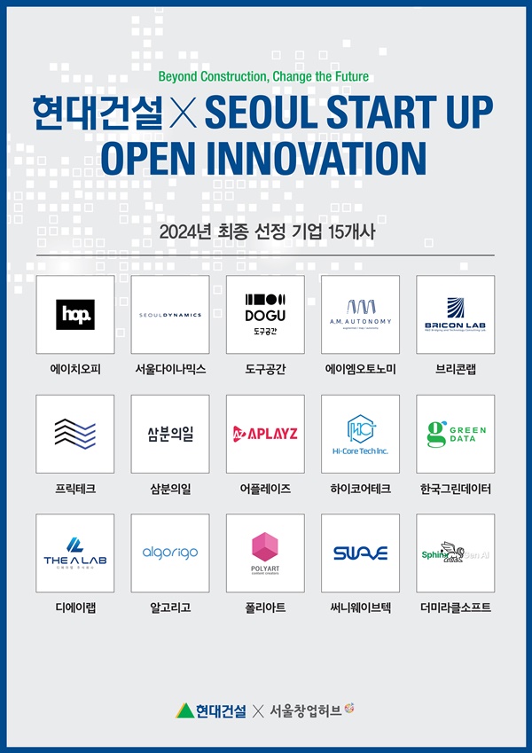 (서울=NSP통신) 강은태 기자 = 현대건설이 우수 스타트업을 지원·육성하기 위한 공모전 ‘2024 현대건설 x Seoul Startup Open Innovation’을 통해 혁신 기술을 보유한 15개 기업을 선정했다고 10일 밝혔다.