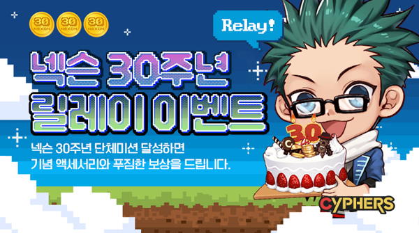 먼저 사이퍼즈는 7월 31일까지 전 이용자가 함께 참여하는 ‘넥슨 30주년 미션 이벤트’를 진행한다. 이벤트 기간 동안 전체 이용자가 플레이한 공성전 누적 판 수에 따라 아이템을 지급한다. 또 넥슨 채널링 서비스 이용자를 위한 혜택 이벤트도 실시한다.