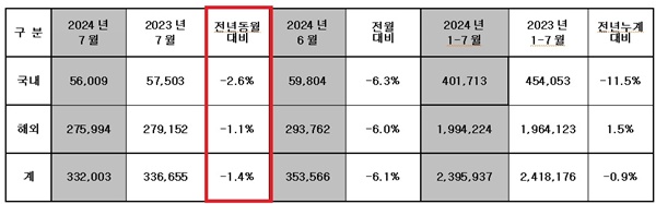 한편 현대차는 2024년 7월 해외 시장에서 전년 동월보다 1.1% 감소한 27만 5994대를 판매했다.