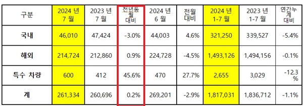 기아의 2024년 7월 해외 판매는 전년 동월 대비 0.9% 증가한 21만 4724대를 기록했다.