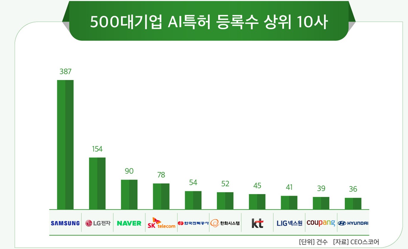 삼성전자는 총 387건을 등록해 500대 기업 중 AI 특허 등록 건수가 가장 많은 곳으로 꼽혔다. 154건을 등록한 LG전자는 2위를 기록했다. 3위부터 10위는 ▲네이버(90건) ▲SK텔레콤(78건) ▲한국전력공사(54건) ▲한화시스템(52건) ▲KT(45건) ▲LIG넥스원(41건) ▲쿠팡(39건) ▲현대자동차(36건) 등이다.