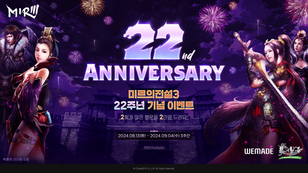 (서울=NSP통신) 이복현 기자 = 위메이드(대표 박관호)의 자회사 전기아이피에서 서비스 중인 MMORPG 미르의 전설3(이하 미르3)가 서비스 22주년 기념 이벤트를 오늘(13일)부터 9월 4일까지 진행한다.