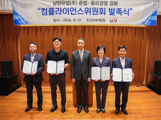(서울=NSP통신) 박유니 기자 = 남양유업은 지난 27일 법조계∙학계∙경제계 등 각 분야 전문가 사내∙외 위원 4명으로 구성한 ‘컴플라이언스 위원회’를 출범했다. 이날 서울 남양유업 본사에서 열린 출범식에는 위원회 구성원과 김승언 남양유업 대표집행임원 사장 및 임직원이 참석했다.