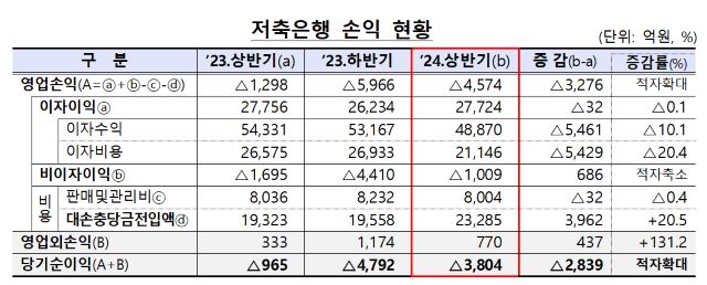 30일 금융감독원이 발표한 ‘2024년 상반기 저축은행 및 상호금융조합 영업실적’에 따르면 올 상반기 저축은행 순이익은 3804억원 손실을 기록함에 따라 전년 동기(-965억원) 대비 적자폭이 확대됐다.